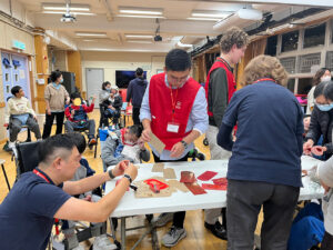 Following the wonderful dance showcase, two teachers from the school distributed fai chun (traditional Chinese New Year banners) to the parents and volunteers. Everyone joyfully read aloud the blessings inscribed on them. Next, the teachers guided participants in using beautiful red packets to craft Chinese decorations. Each person put their best effort into creating unique wall-hanging ornaments. At the session’s end, groups selected their most impressive decoration and displayed it on the festive board.